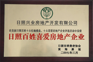 ·2007年3月,興業(yè)房地產(chǎn)被日照市消費(fèi)者協(xié)會(huì)日照百姓喜愛(ài)房地產(chǎn)企業(yè)