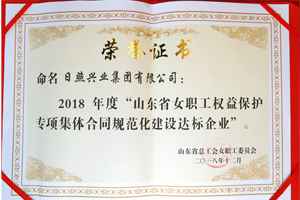 2018年12月,山東省總工會(huì)授予日照興業(yè)集團(tuán)“2018年度山東省女職工權(quán)益保護(hù)專項(xiàng)集體合同規(guī)范化建設(shè)達(dá)標(biāo)企業(yè)”